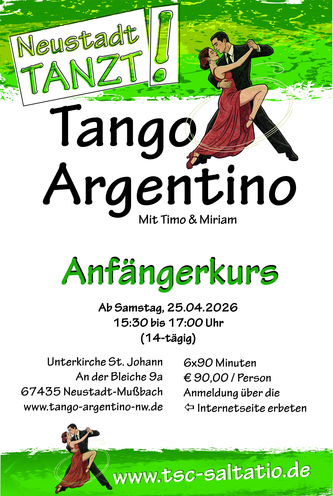Wenn ihr noch nicht sicher seid, ob der Tango-Argentino euch in seinen Bann gezogen hat, zeigen euch Timo und Miriam in einem abgeschlossenen Anfängerkurs mit 6x90 Minuten die Grundlagen der Bewegungen im Tango-Argentino, geben euch eine Auswahl an Schrittkombinationen und einen Einblick in das Thema Führung. Alternativ könnt Ihr gleich Mitglied im Verein/TSC-Saltatio werden und sowohl den Anfängerkurs als auch das reguläre Training besuchen